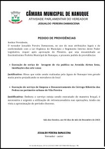 Na sessão da Câmara Municipal de Nanuque em 02 de dezembro de 2025, o vereador Jesualdo Pereira Damascena,  utilizou o instrumento do Pedido de Providências para requerer da Prefeitura ações imediatas de infraestrutura e limpeza, com foco na preparação para o período de chuvas.