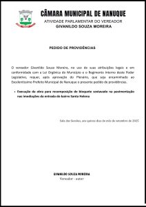 O vereador Givanildo Souza Moreira, no exercício de suas atribuições legais e em conformidade com a Lei Orgânica do Município e com o Regimento Interno da Câmara Municipal, apresentou requerimento solicitando o encaminhamento de pedido de providências ao Excelentíssimo Prefeito Municipal de Nanuque.